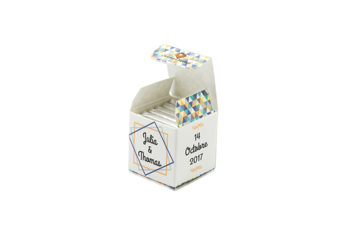 Un cube du thème Enfantin est compact, rempli à ras bord, pour un cadeaux aux invités souvenir que personne n’oubliera ! A l’intérieur, 6 chocolats personnalisés de ce même thème, emballés individuellement et également décorés et personnalisés avec votre(s) prénom(s), date de l’évènement, un « Oui » ou un « Merci » … Tout est là, tout est dit !