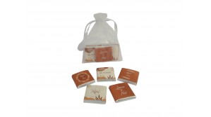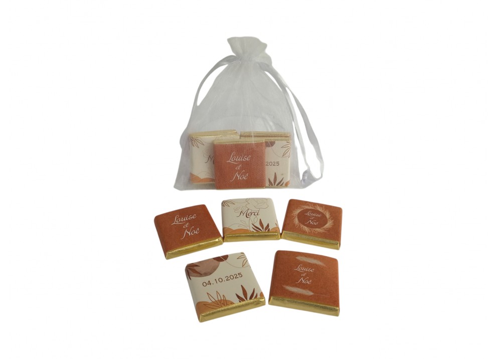 Le sachet organza est rempli de 5 chocolats personnalisés "Terracotta". Le cadeau aux invités idéal qui ressemble à quelque chose de connu mais O surprise, c’est bien meilleur que des dragées impersonnelles ! A l’intérieur retrouvez des chocolats à l’effigie des mariés ou du baptisé, ou encore du nouveau-né ; La classe !