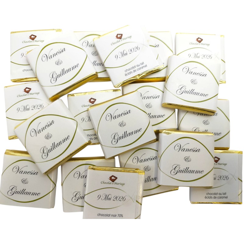 Les chocolats « en vrac » du thème Champêtre sont des carrés de chocolat de 5g personnalisés au(x) prénom(s) de votre choix et à la date de l’évènement. Ici, il n’y a pas de contenant. Offrez les donc au moment du café (idéal pour les petits budget), ou garnissez vous-mêmes vos propres contenants (idéal pour les créatifs) avec ces délicieux chocolats.